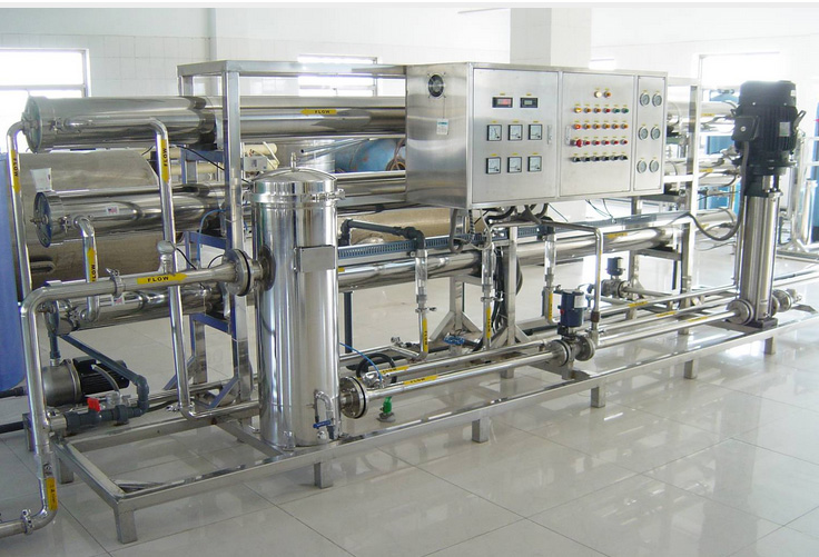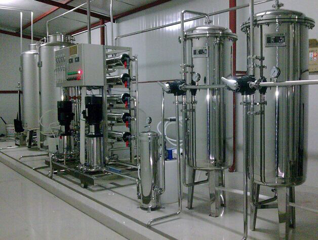 原水→原水加壓泵→多介質過濾器→活性炭過濾器→軟水器→精密過濾器→一級反滲透 →PH調節→中間水箱→二級反滲透→純水箱→純水泵→微孔過濾器→用水點